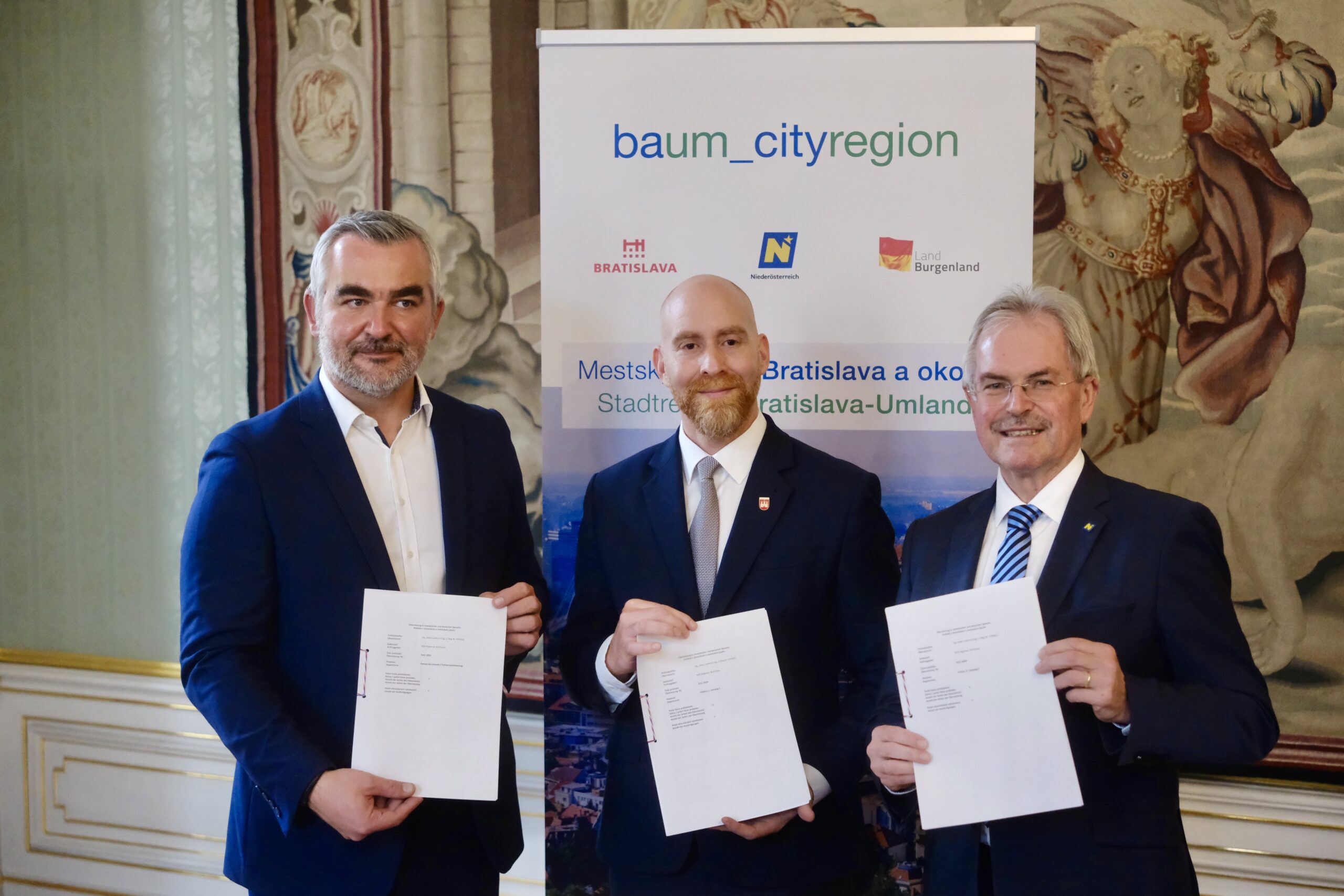 Bratislava, 12.11.2025: Im Primatialpalais in Bratislava wurde ein Meilenstein für die Zusammenarbeit in der grenzüberschreitenden Stadtregion Bratislava-Umland („baum_cityregion“) gesetzt. Am Programm stand die konstituierende Sitzung des Politischen Gremiums der Arbeitsgemeinschaft baum_cityregion. Das Politische Gremium ist das höchste Organ dieser Arbeitsgemeinschaft. Damit wurde der Startschuss für eine noch intensivere Kooperation mit der slowakischen Hauptstadt gegeben. Der Präsident des Niederösterreichischen Landtages Karl Wilfing, der burgenländische Landesrat Heinrich Dorner, Bratislavas Vizebürgermeister Jakub Mrva und Österreichs Botschafter in der Slowakei, Herr Johannes Wimmer, nahmen an diesem historischen Arbeitstreffen teil. Die Zusammenarbeit im Rahmen von „baum_cityregion“ kann auf eine mittlerweile 15-jährige Historie zurückblicken, gleichzeitig gibt es ehrgeizige Pläne für die Zukunft.